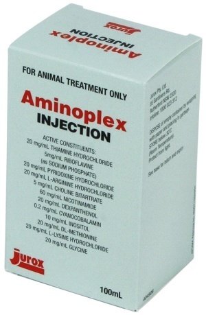 Buy AMINOPLEX INJECTION 100ML online is a vitamin and amino acid injection supplement for use in cattle, horses, dogs and cats as an aid in the treatment of debilitated animals and a supplement for working animals.