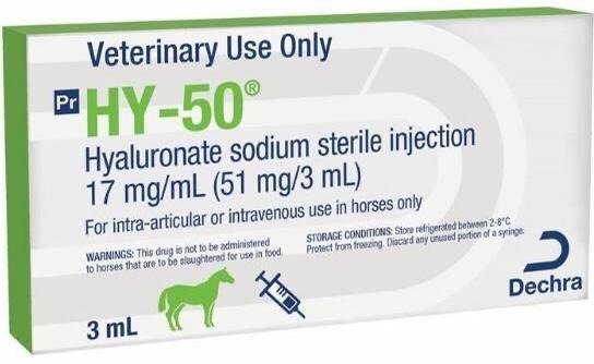 HY-50 VET is indicated for Intra-articular and intravenous treatment of lameness caused by joint dysfunction associated with non-infectious synovitis.HY-50 VET ’s fermentation and purification processes, coupled with its high molecular weight, make it the sodium hyaluronate of choice. Delivering a high dose of sodium hyaluronate per ml, manufacturing method produces a highly effective and easy to use injection, free from animal proteins and therefore presenting minimal opportunity for adverse local reaction HY-50 VET